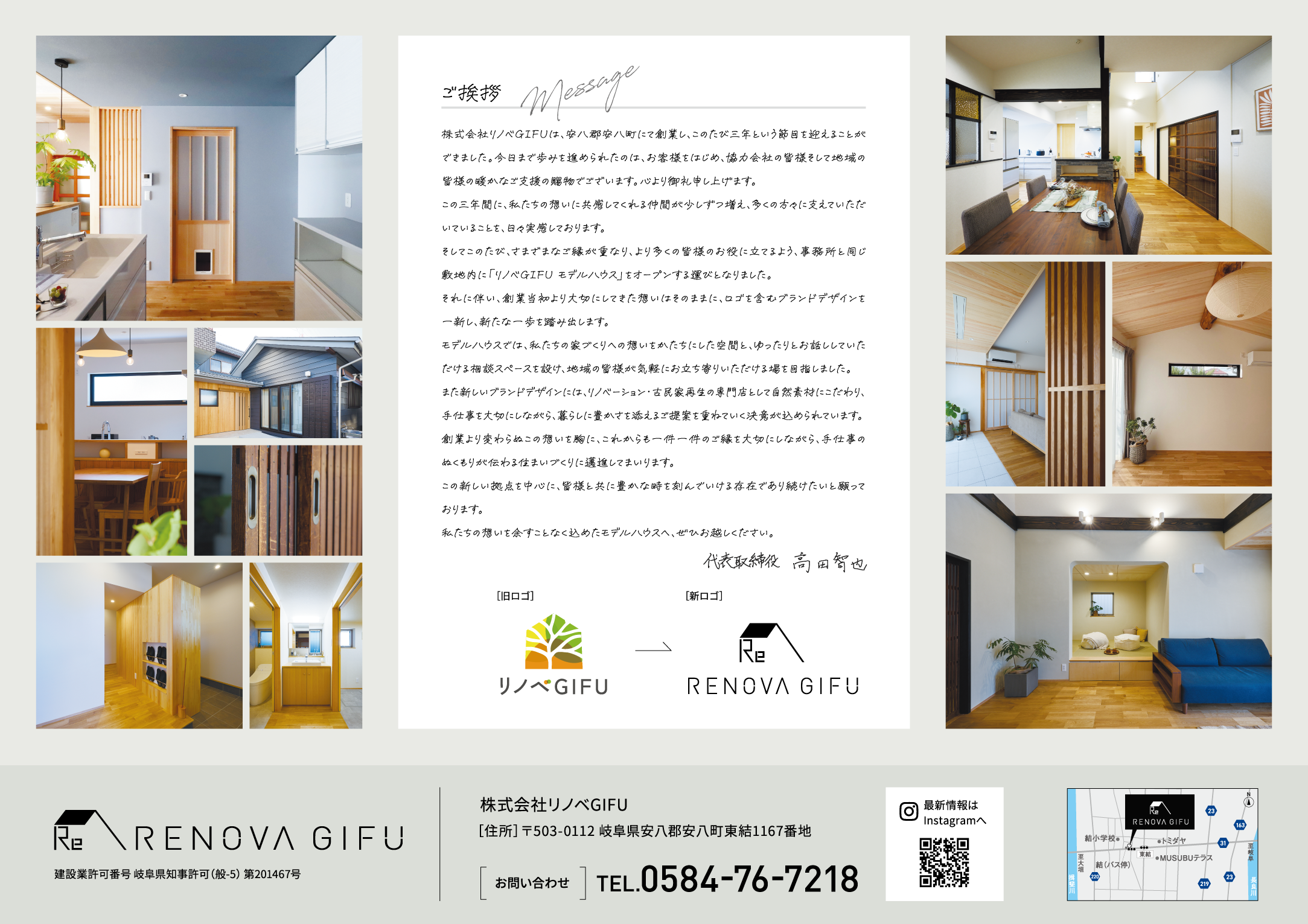 株式会社リノベGIFUは、安八郡安八町にて創業し、このたび三年という節目を迎えることができました。今日まで歩みを進められたのは、お客様をはじめ、協力会社の皆様そして地域の皆様の暖かなご支援の賜物でございます。心より御礼申し上げます。