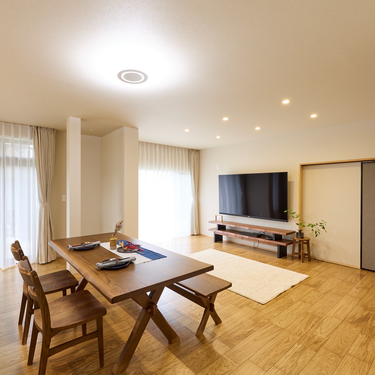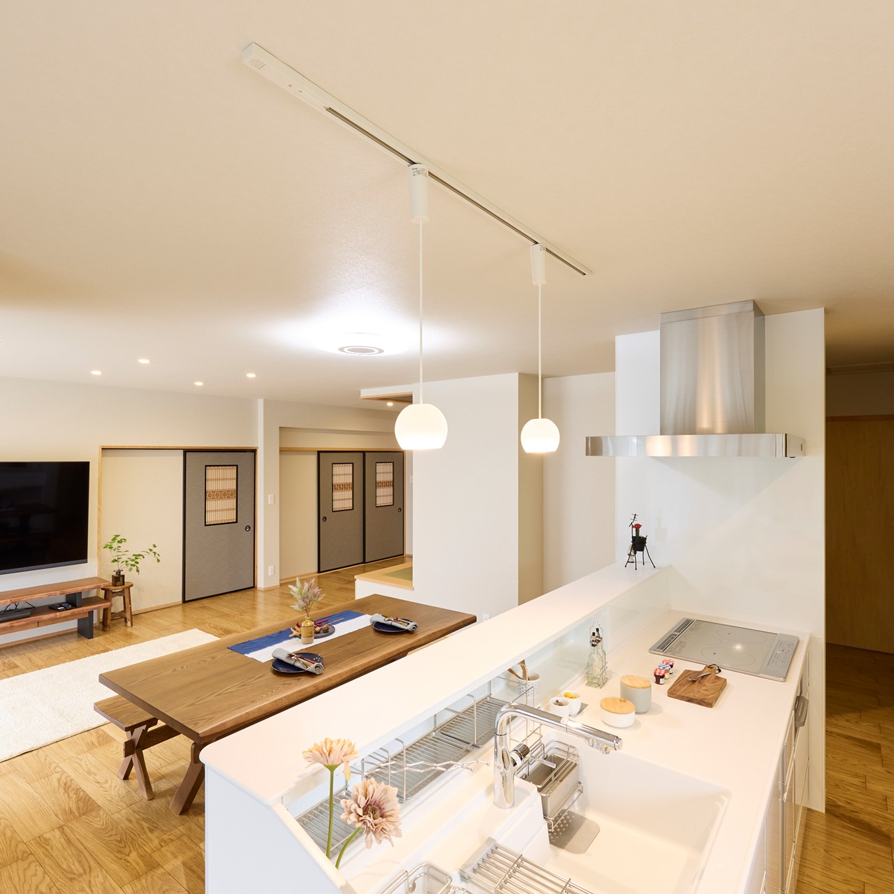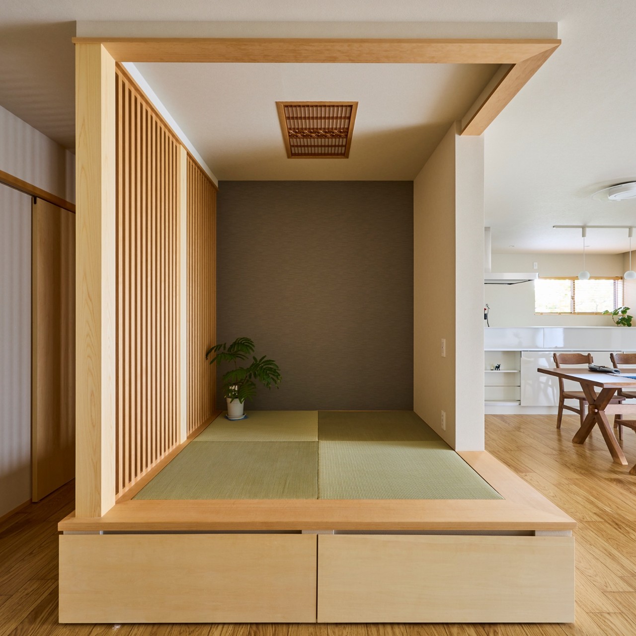 ご主人様で3代目のお住まい。先代よりとても大切に住まわれ定期的にお住まいのメンテナンスも進められていました。今回ご夫婦の終の棲家と同時に、近くにお住いのお孫様がいつでも気軽に遊びまわれるスペースの確保も考慮し、大きなLDKとご夫婦が将来心地よく暮らしていただけるようリノベーションいたしました。玄関ホールは昔ながらの踏み天井(2階の床が1階の天井になっている事)と趣きを残し、気持ちよくお客様を迎え入れます。当時は北側にキッチン・リビングが位置していたため、風通し・明るさがお悩みでしたが、今回全く利用されていなかった南側の2部屋にLDKすべてを配置しました。自然光がリビングの奥までしっかりと差し込み、心地よい風が通り抜けていきます。当初は畳コーナーの部分もフロアにとのことでしたが、大きすぎても無駄が発生するため、あえて畳コーナーをご提案。ご主人様やお孫様のお昼寝、一時的に洗濯物を取り込んでおくスペースと、色々な活用方法をご夫婦がこれから模索されます。お施主様一番のお気に入りは、畳コーナーを中心にLDK~寝室を回遊できるプラン。寝室からはリビングにもキッチンにも出入りできる工夫をしました。ご夫婦が暮らすうえで温度のバリアフリー(どのスペースも同じ室温の空間)を意識して、リビングから脱衣室・トイレに出入りできます。トイレ入口はリビングからの視線をそらすため桧の格子を採用しました。お施主様にとっては最後の大きなリノベーションとなりました。これから先お孫さんの成長を感じながら、そしてご夫婦が豊かに暮らしていただけるよう、私たちは精一杯お手伝いいたします。