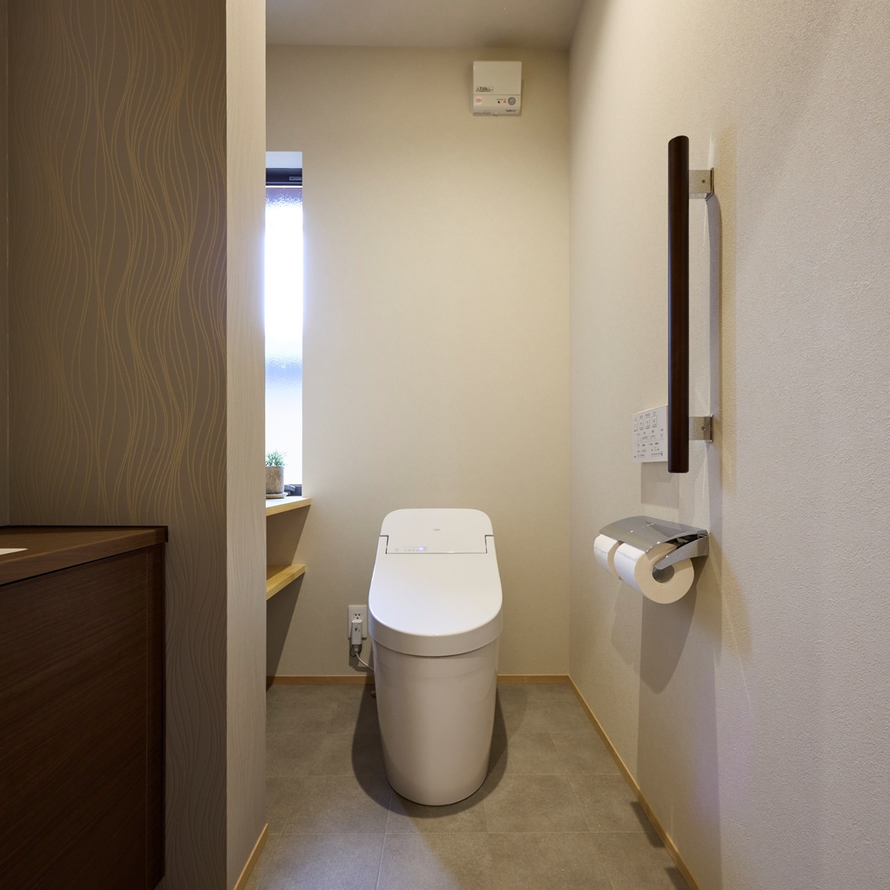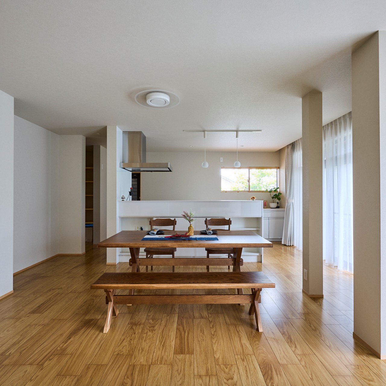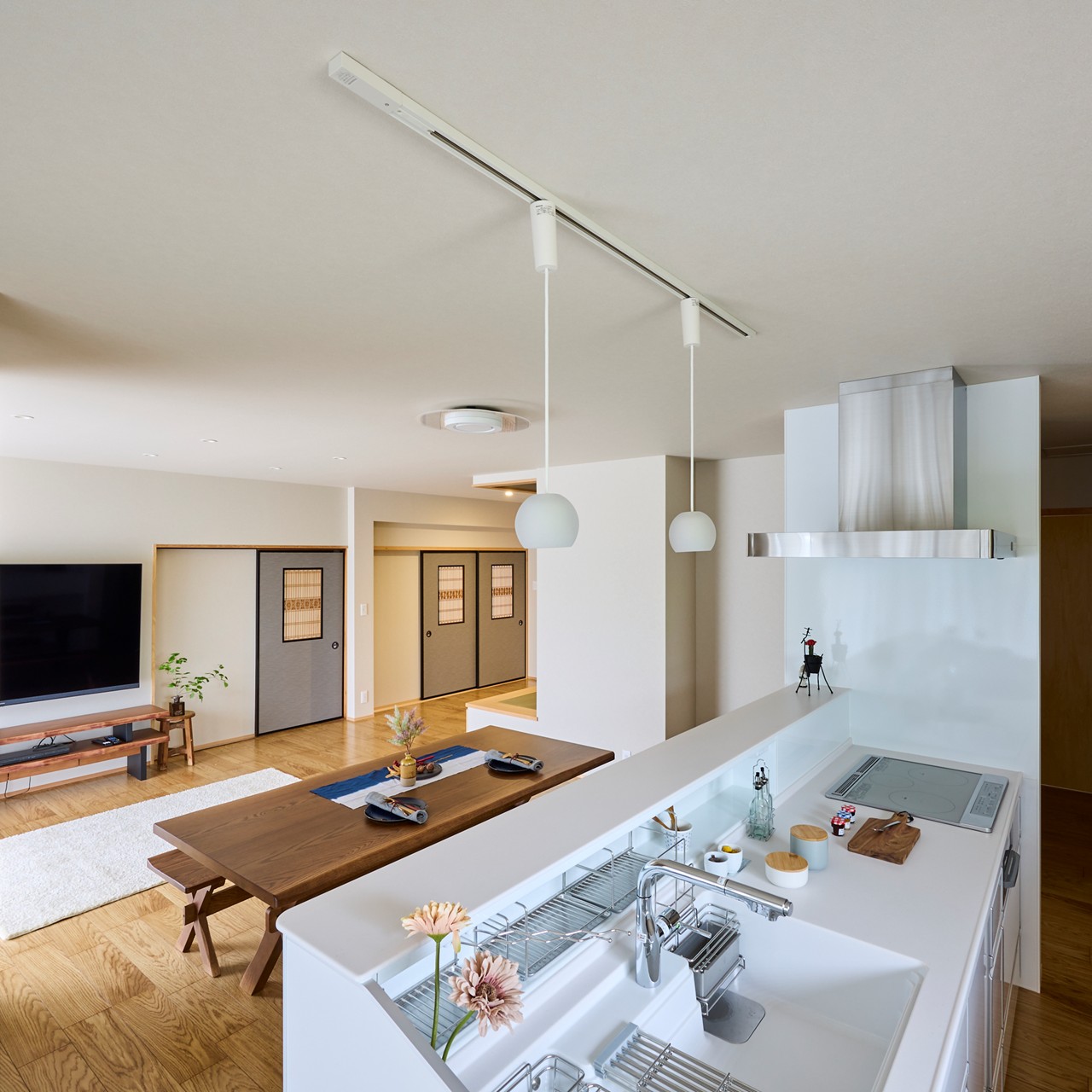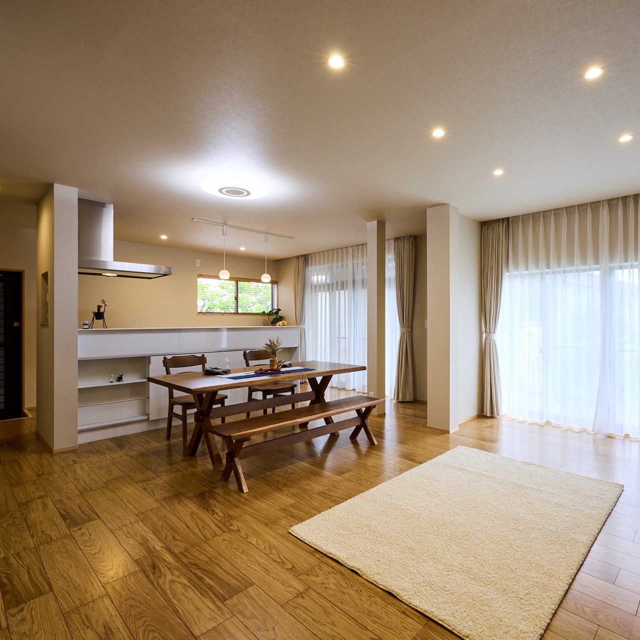 ご主人様で3代目のお住まい。先代よりとても大切に住まわれ定期的にお住まいのメンテナンスも進められていました。今回ご夫婦の終の棲家と同時に、近くにお住いのお孫様がいつでも気軽に遊びまわれるスペースの確保も考慮し、大きなLDKとご夫婦が将来心地よく暮らしていただけるようリノベーションいたしました。玄関ホールは昔ながらの踏み天井(2階の床が1階の天井になっている事)と趣きを残し、気持ちよくお客様を迎え入れます。当時は北側にキッチン・リビングが位置していたため、風通し・明るさがお悩みでしたが、今回全く利用されていなかった南側の2部屋にLDKすべてを配置しました。自然光がリビングの奥までしっかりと差し込み、心地よい風が通り抜けていきます。当初は畳コーナーの部分もフロアにとのことでしたが、大きすぎても無駄が発生するため、あえて畳コーナーをご提案。ご主人様やお孫様のお昼寝、一時的に洗濯物を取り込んでおくスペースと、色々な活用方法をご夫婦がこれから模索されます。お施主様一番のお気に入りは、畳コーナーを中心にLDK~寝室を回遊できるプラン。寝室からはリビングにもキッチンにも出入りできる工夫をしました。ご夫婦が暮らすうえで温度のバリアフリー(どのスペースも同じ室温の空間)を意識して、リビングから脱衣室・トイレに出入りできます。トイレ入口はリビングからの視線をそらすため桧の格子を採用しました。お施主様にとっては最後の大きなリノベーションとなりました。これから先お孫さんの成長を感じながら、そしてご夫婦が豊かに暮らしていただけるよう、私たちは精一杯お手伝いいたします。