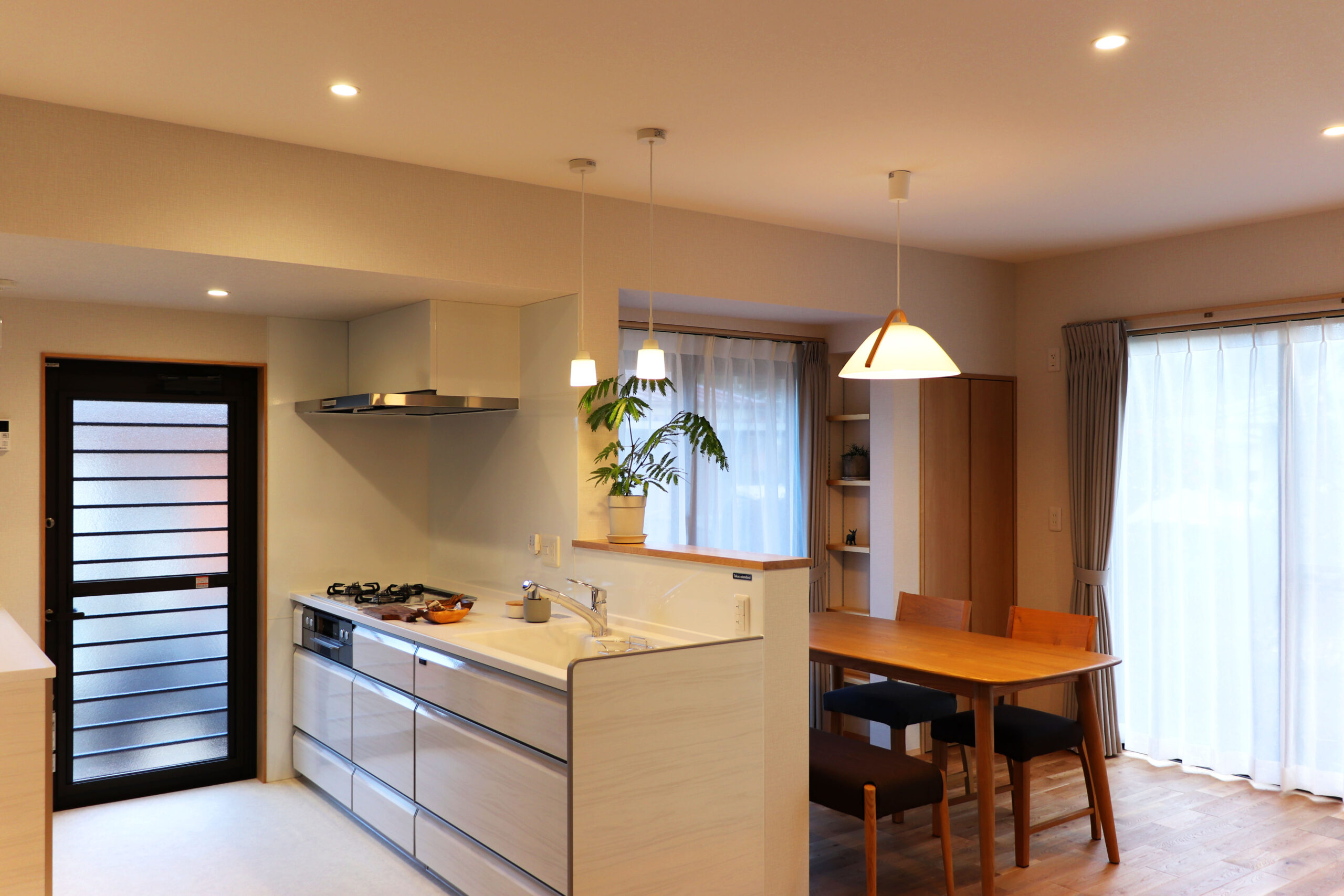 当時お庭に使われていた踏み石をアプローチに再利用し、和風テイストを残しながら外観には桧の羽目板とジョリパッドの塗り壁を採用しモダンな佇まいに仕上げました。広縁と和室しかなかった空間には常に自然の光が差し込むLDKを配置しご夫婦がゆったりと過ごせる空間となりました。