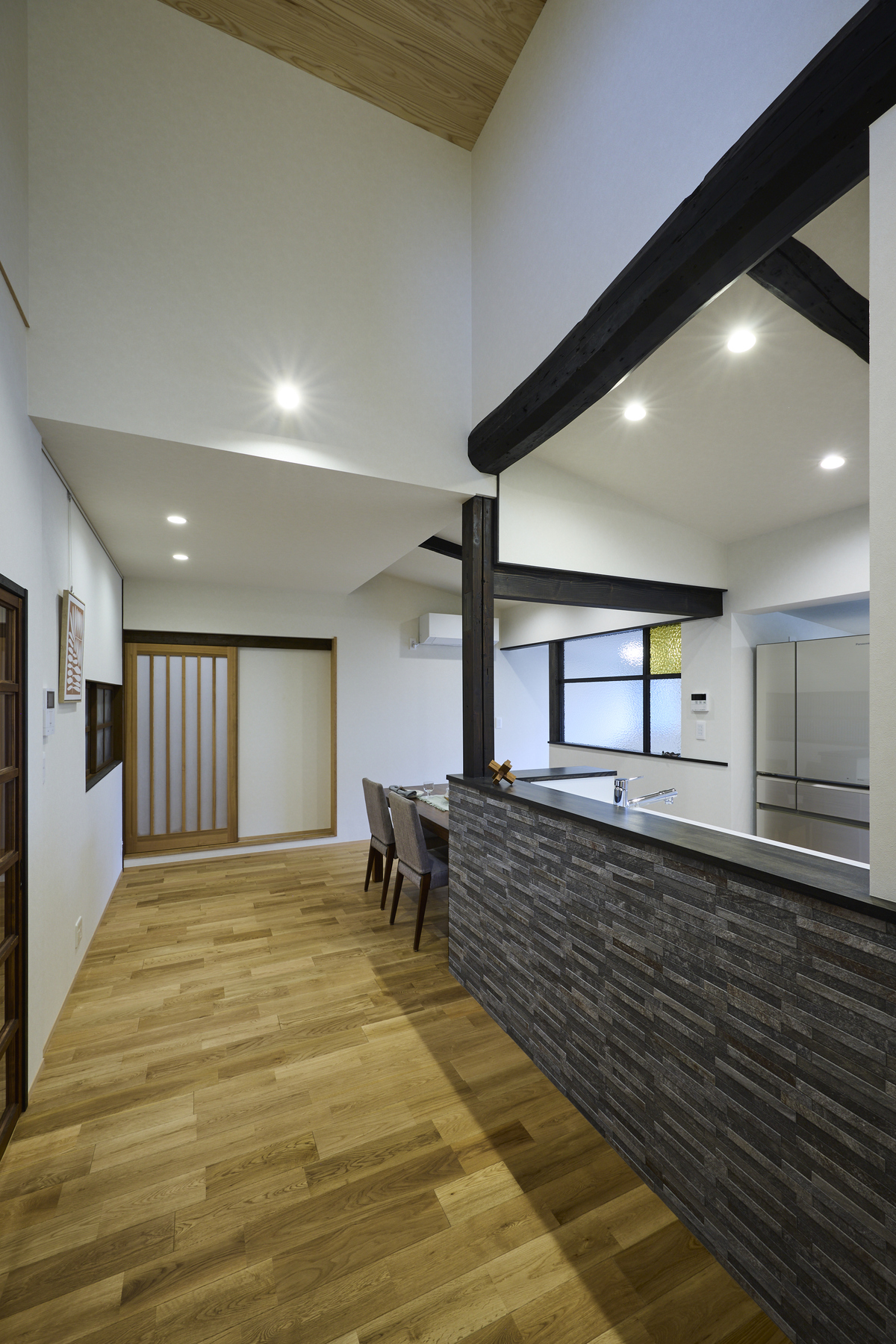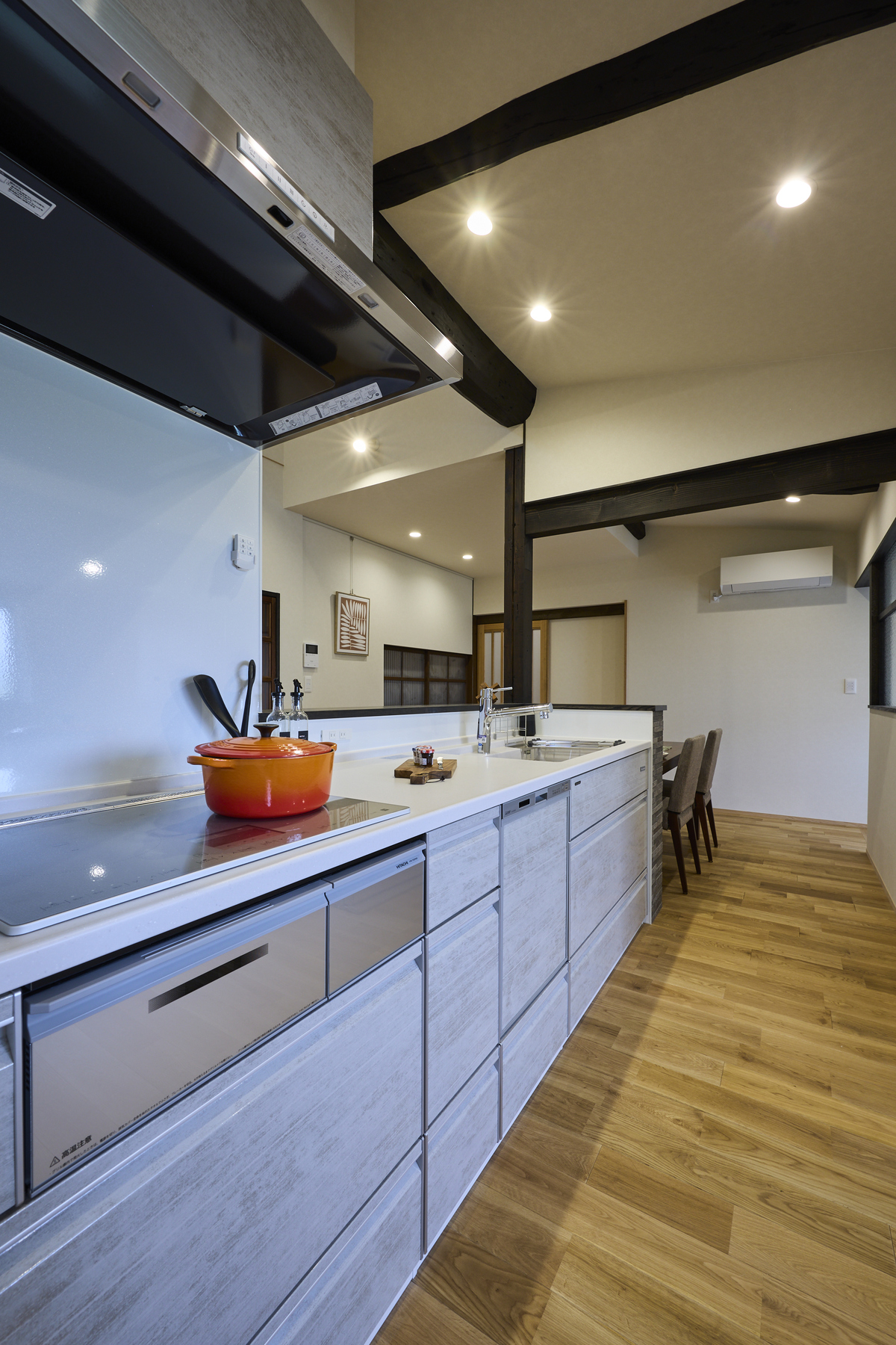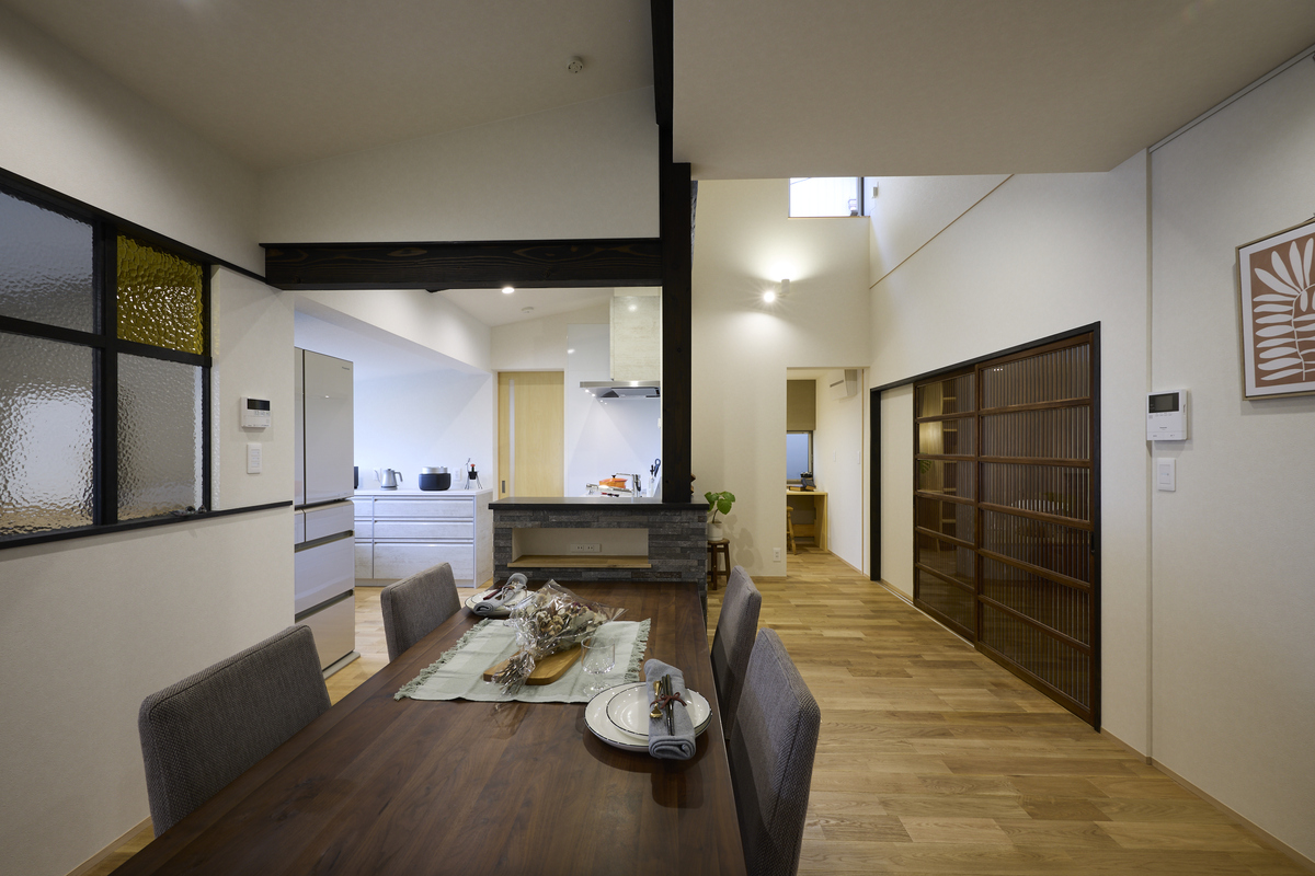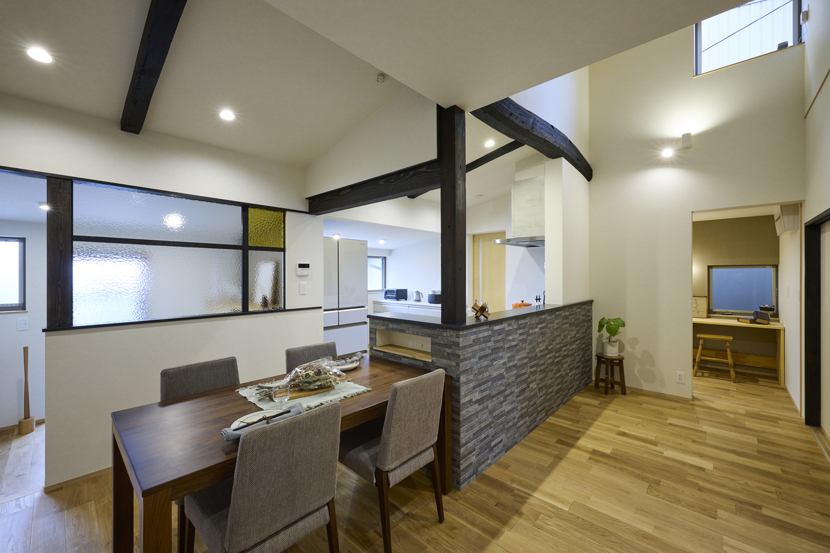 今回のリノベーションでは、快適な断熱性能と、古材が醸し出す豊かな味わいを両立させました。長年家族を守ってきた梁や柱、天井板など、傷や色の風合いをそのままに残して再活用。経年美を大切にした住み繋ぐリノベーションで、懐かしさと新しさが調和した空間に。断熱性能にもこだわり、壁・床・天井の断熱施工に加えて高性能な窓サッシを採用。