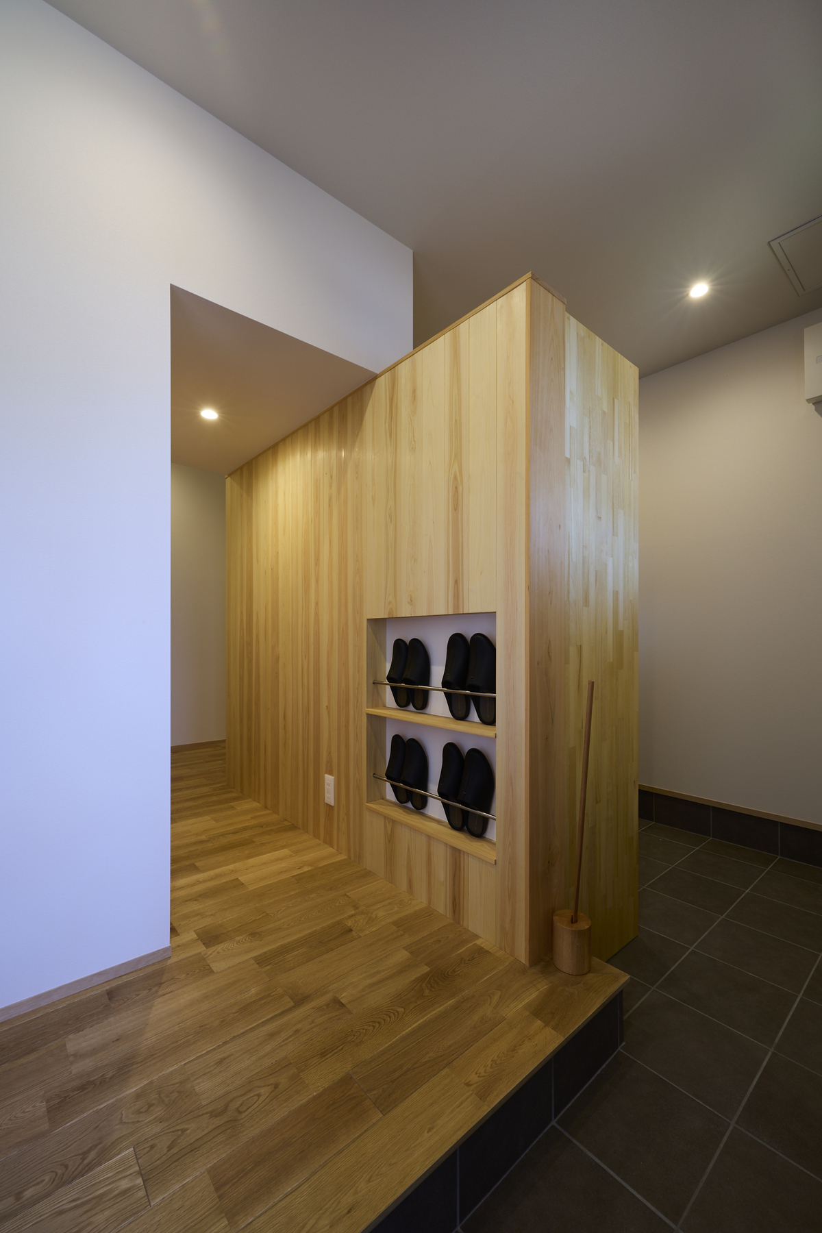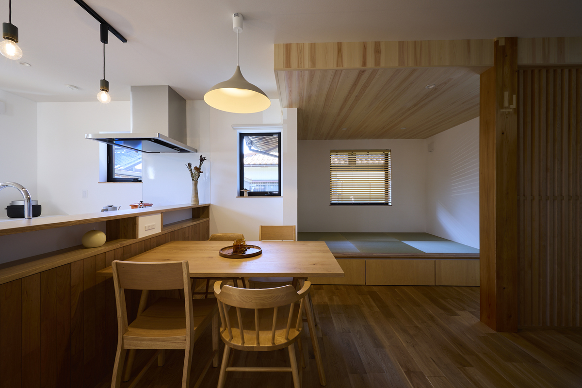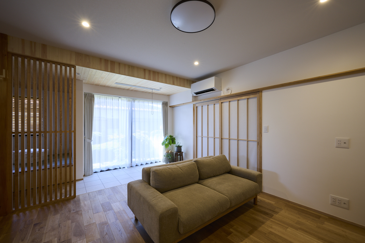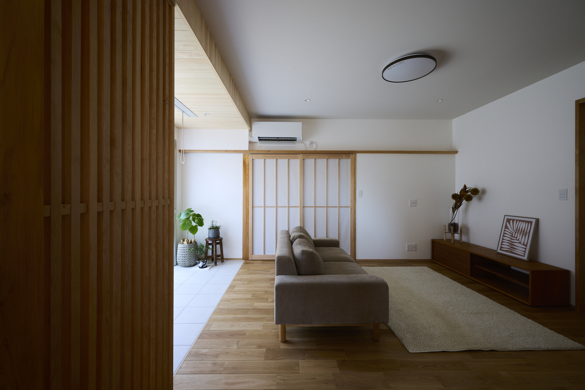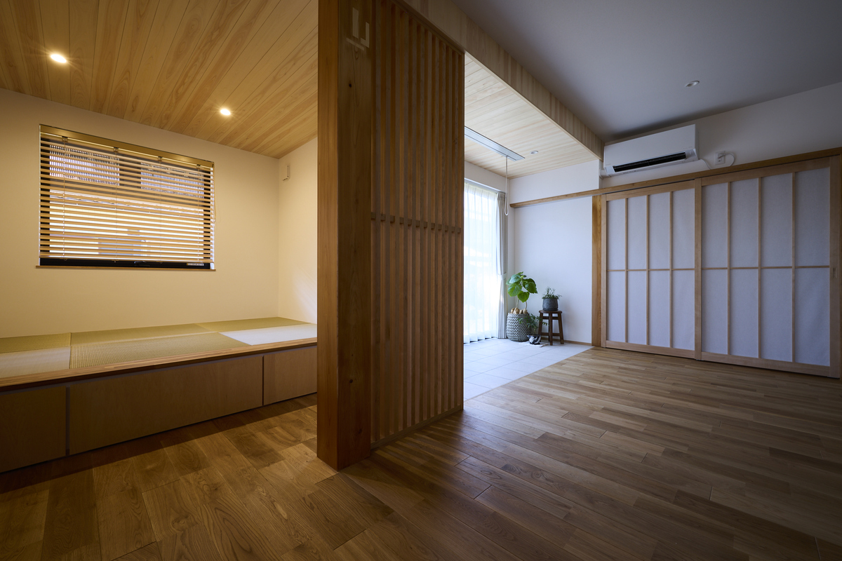 ふたりの暮らしをもっと心地よくするためのリノベーション。趣味の道具や季節の持ち物もすっきり収められる玄関横のクローク収納は桧で造作空間いっぱいに桧の香りが広がります。もともとは玄関だったスペースをLDKに取り込み安らぎのヌックスペースへ。リビングの一角にはタイル張りの床を設け植物と共に過ごせるお気に入りの場所に。自然光と無垢の木に包まれた空間がこれからの暮らしをやさしく支えてくれます。