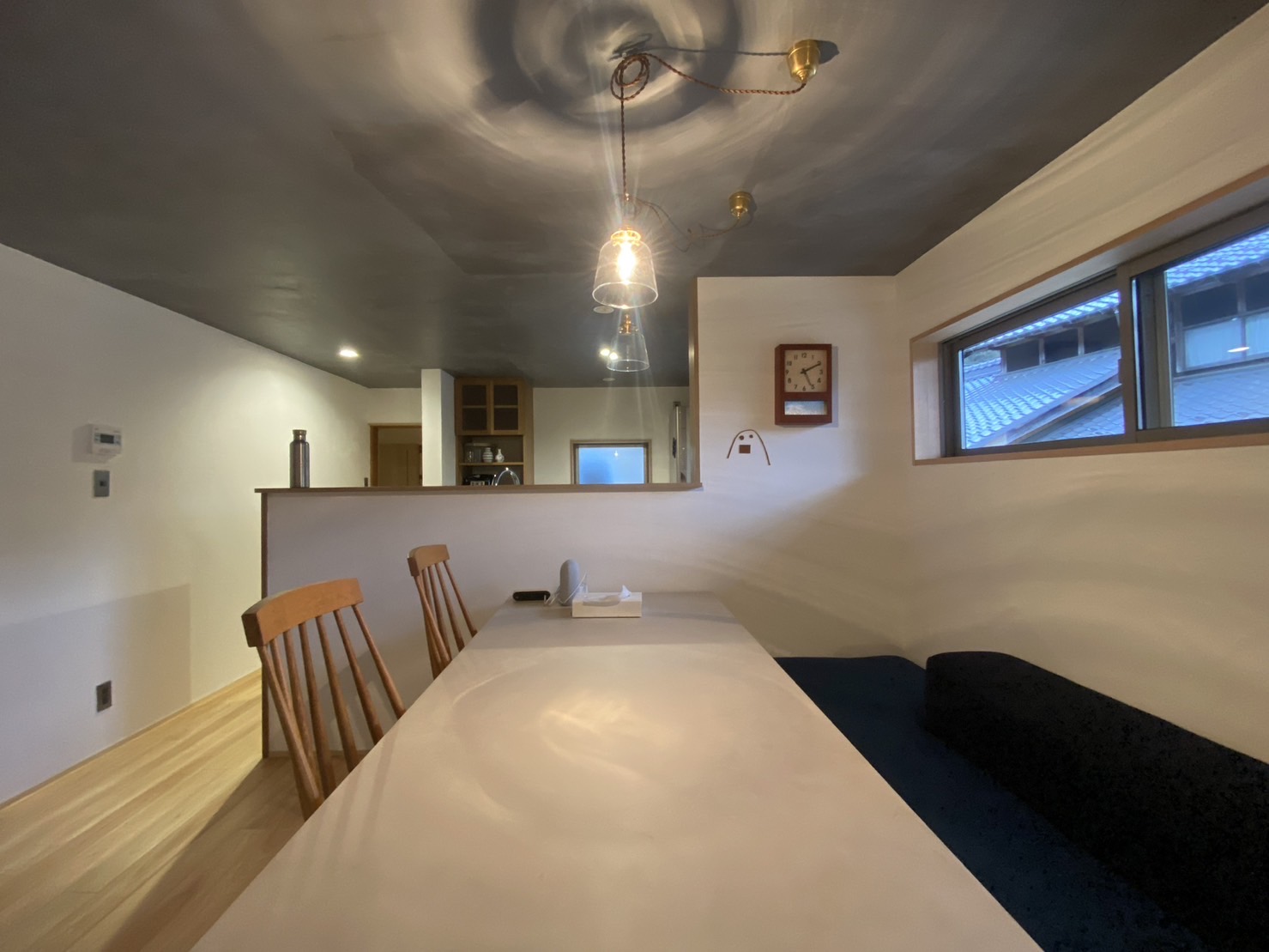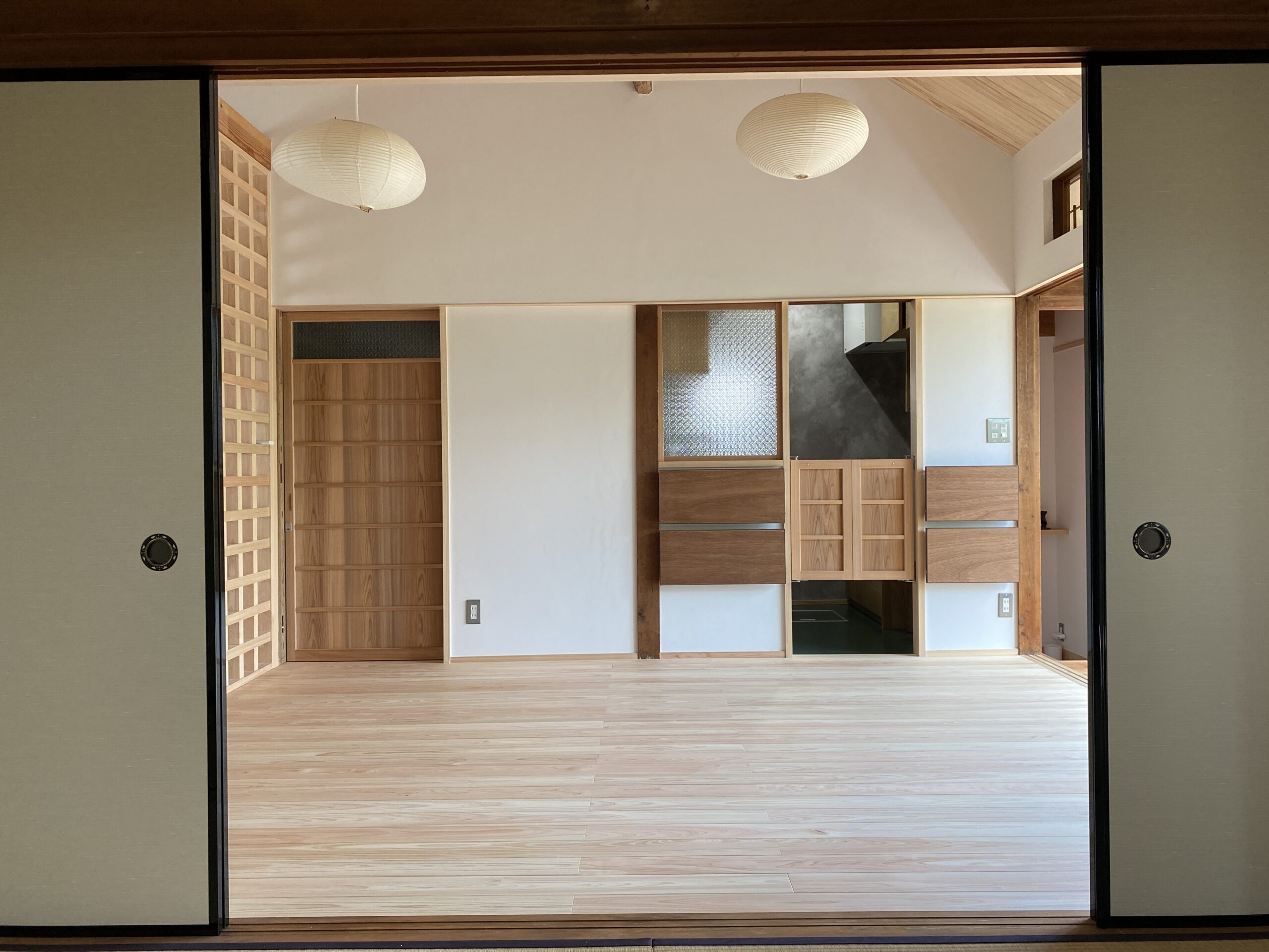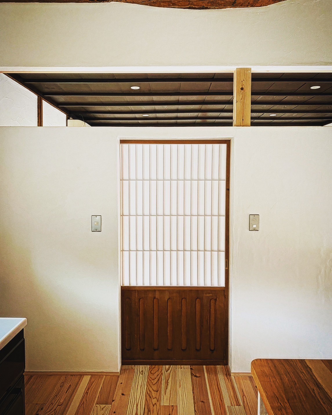 ご夫婦の寝室は、お施主様とスタッフにより、DIYで漆喰を施工しました。さらに、古建具を再利用し、昔ながらの雰囲気を残しました。奥様の使い勝手を細かくヒアリングして、キッチン・カップボードはオーダーメイドで製作。ダイニングの照明は、お料理をよりおいしく照らすために設計されています。LDKには、桧の無垢板を採用し、お子様が裸足でも走り回れるような気持ちよさです。