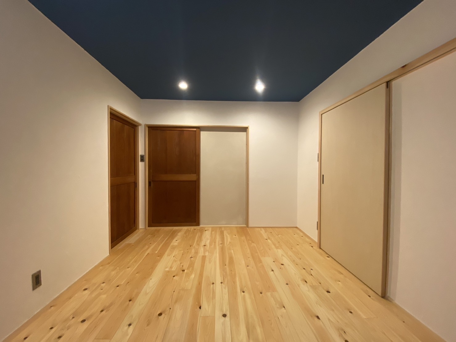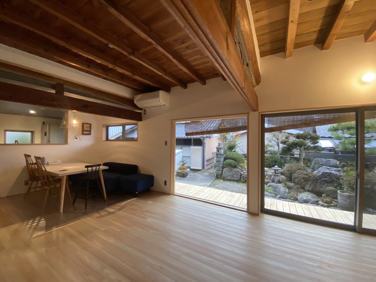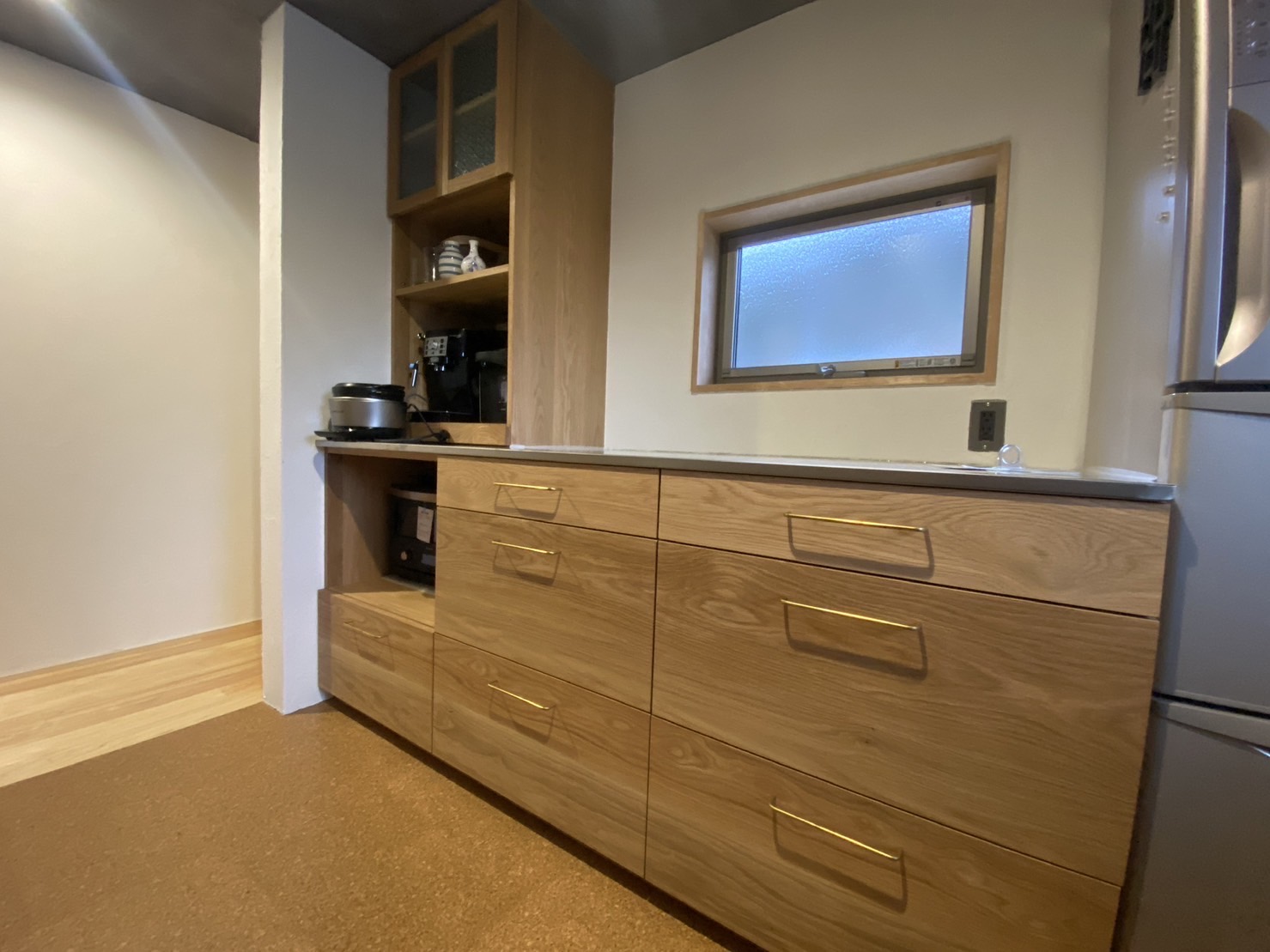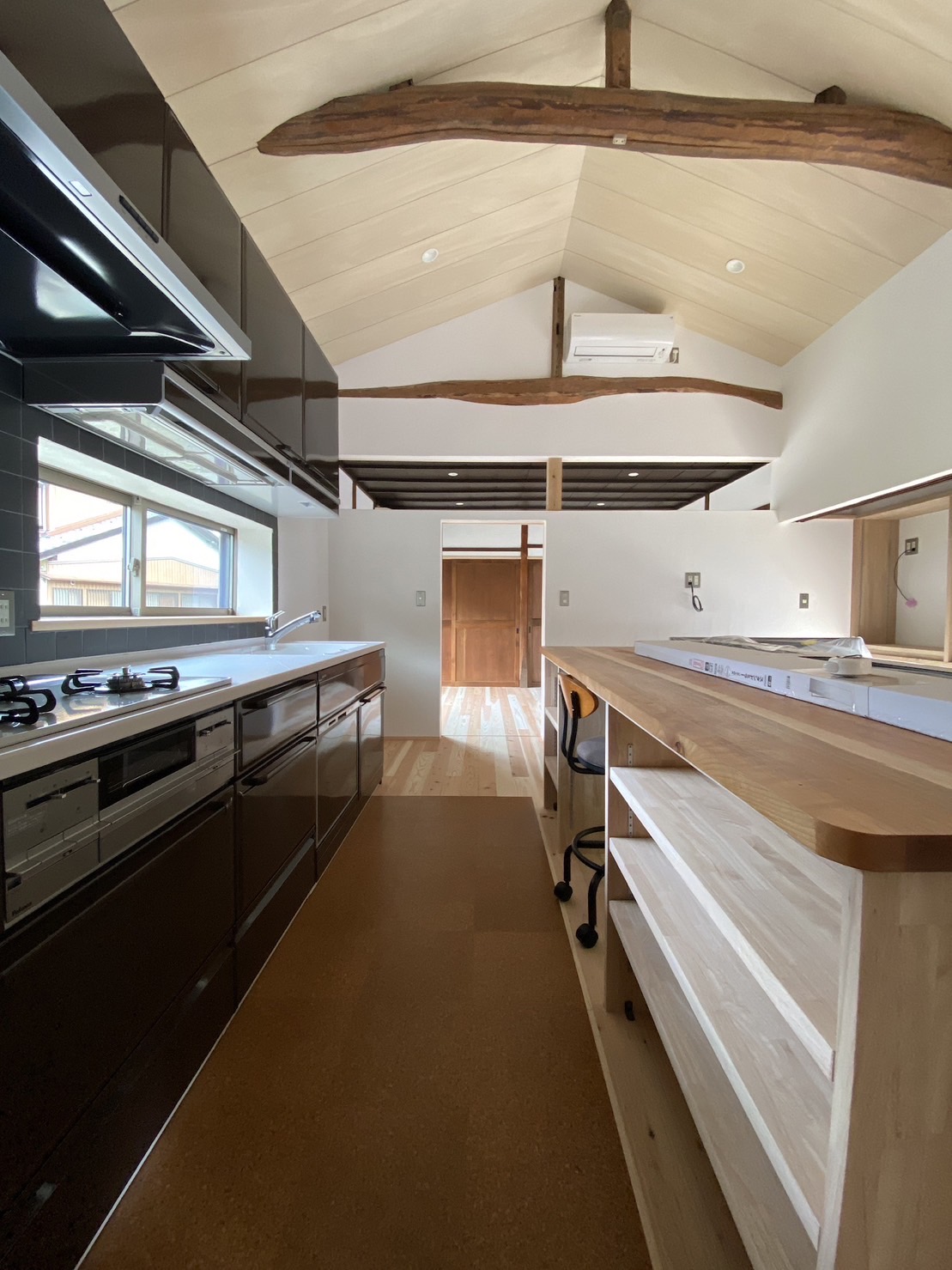 ご夫婦の寝室は、お施主様とスタッフにより、DIYで漆喰を施工しました。さらに、古建具を再利用し、昔ながらの雰囲気を残しました。奥様の使い勝手を細かくヒアリングして、キッチン・カップボードはオーダーメイドで製作。ダイニングの照明は、お料理をよりおいしく照らすために設計されています。LDKには、桧の無垢板を採用し、お子様が裸足でも走り回れるような気持ちよさです。